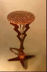 On your left is the Airy Flare bar stool without backrest, shown in burst rust finish with cheetah upholstery. It measures 30.5” high, 20.5” across, and weighs 21.5 lbs.